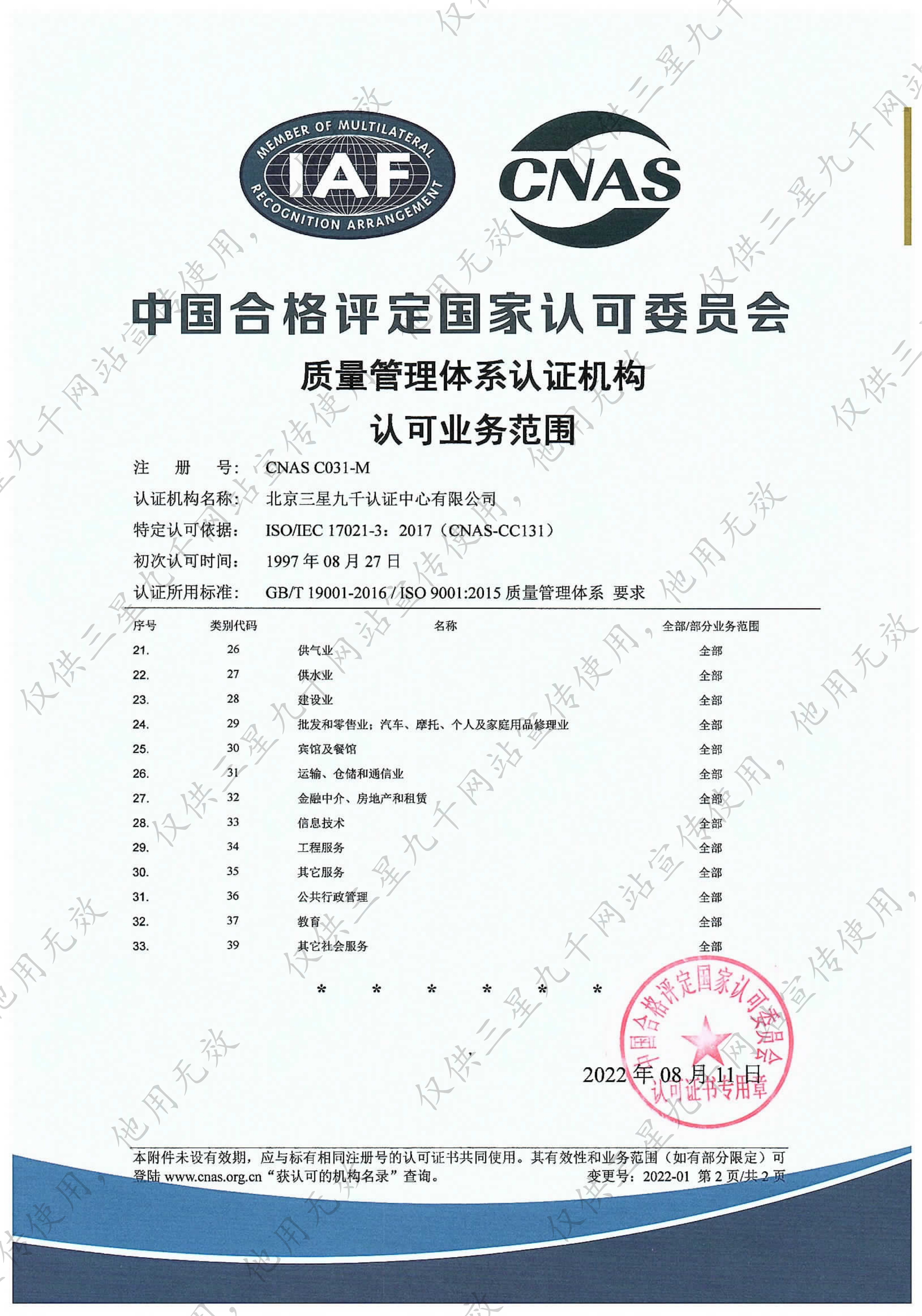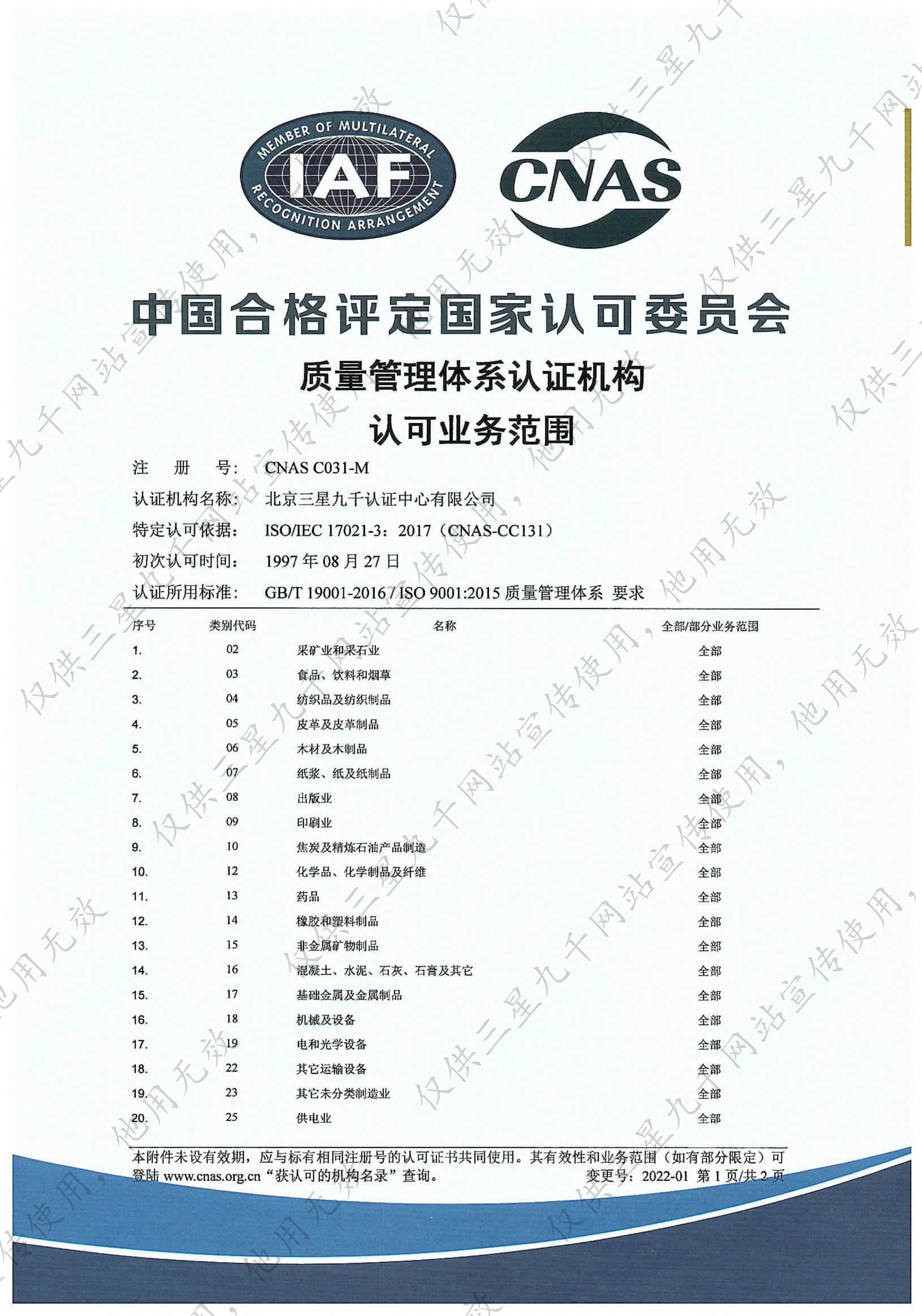 工程建设施工企业质量管理体系认证机构认可业务范围证书