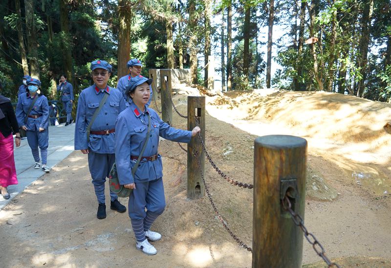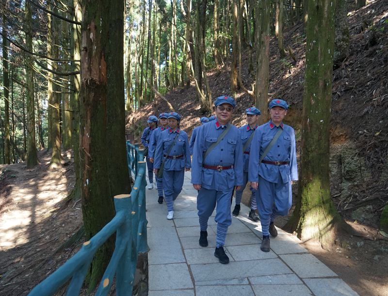 在黄洋界,党员们穿上红军服,重温了黄洋界保卫战这段光荣胜利历史,毛主席的诗词《西江月》,“山下旌旗在望,山头鼓角相闻……黄洋界上炮声隆,报道敌军宵遁。” 大家跟随着朱德等老一辈革命家的足迹,走在红军挑粮小道上,踏着湿滑的山路,迈着艰难的步伐,深深体会着老一辈革命家艰苦卓绝的斗争,深深感受着那段不平凡的峥嵘岁月。