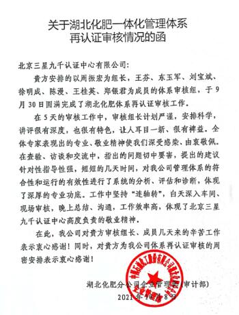 10月8日,公司收到湖北化肥分公司发来感谢信,对三星九千审核组表现出的专业、敬业精神表示衷心感谢。客户的认可是三星九千前进的动力。今后三星九千将会一如既往,为湖北化肥做好QESEn管理体系建设的服务工作,为湖北化肥对标一流化工企业管理提升贡献力量。