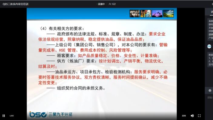 2022年3月21日至24日,北京三星九千认证中心有限公司举办了2022年第一期质量、环境、职业健康安全管理体系内审员直播培训课,培训讲师为公司资深审核员王秀兰老师。中国石化催化剂有限公司南京分公司、中国石油化工股份有限公司安庆分公司、中国石油化工股份有限公司石家庄炼化分公司等公司参与了此次培训。