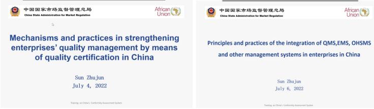 中国非盟第一期质量基础设施能力建设培训共八门课程,全程英文授课。得益于总局、合格评定中心、认研中心对三星九千专业实力的信任和认可,本期培训三星九千承担了《质量认证在推动企业加强质量管理方面的作用机理和中国实践》、《企业整合质量管理体系、环境管理体系、职业健康安全管理体系等多管理体系的原则与中国实践》两门课程的培训任务。