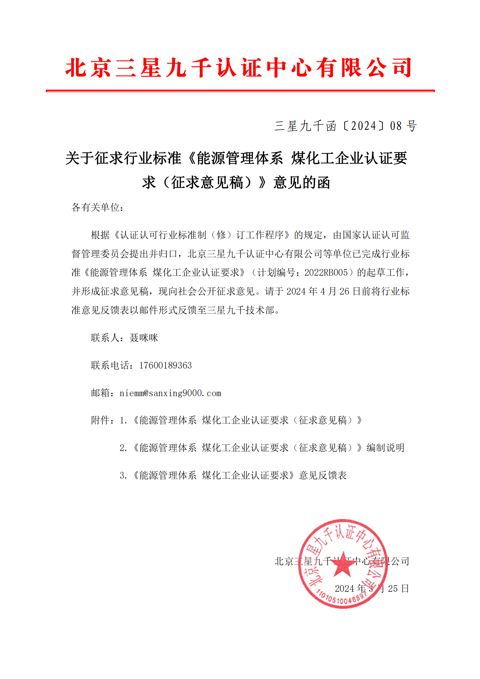 三星九千函〔2024〕08号 关于征求行业标准《能源管理体系 煤化工企业认证要求(征求意见稿)》意见的函