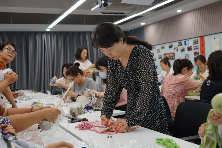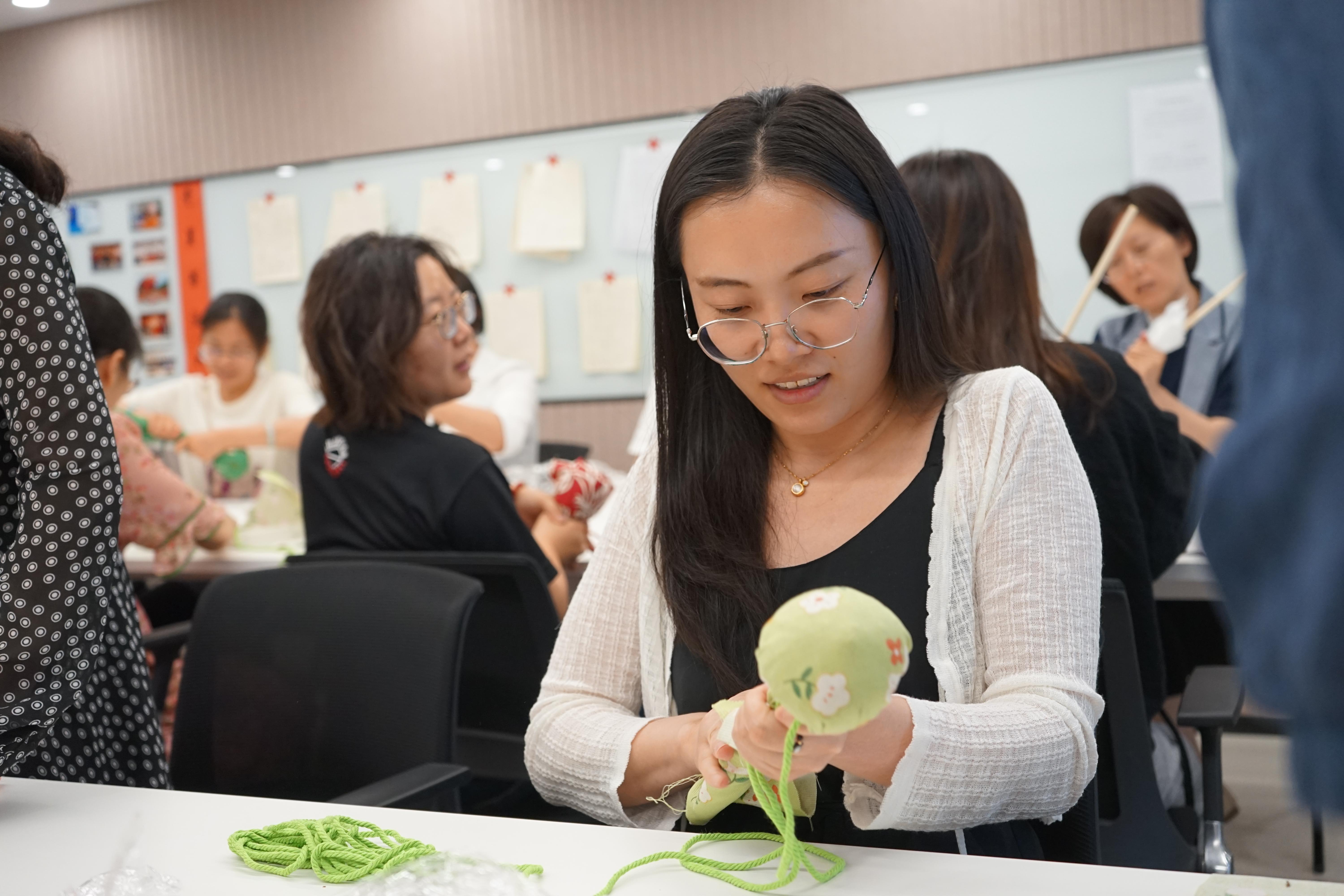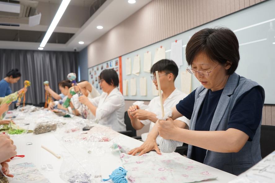 活动伊始,活动组织者首先向大家介绍了端午节挂艾草的民俗背景及艾草药用价值和中医养生知识,让大家对艾草有了更深入的了解;进入手工DIY环节,向大家现场演示了艾草锤的制作方法和使用方法。随后,员工们纷纷动手尝试,按顺序铺平布料、将晒干的艾草放在中间,用布料裹住,捏成一个紧实的圆形,插入木棍,拿出绳子将剩余的布料紧紧捆绑成柱形,大家有条不紊,一边完善手工步骤,一边互帮互助,一个个精致的艾草锤在大家的手中逐渐成形,随后大家用做好的艾草锤敲敲肩颈、捶捶后背,拍打之间,经络畅达、身心舒畅,整个活动现场充满了欢声笑语,气氛热烈而融洽。