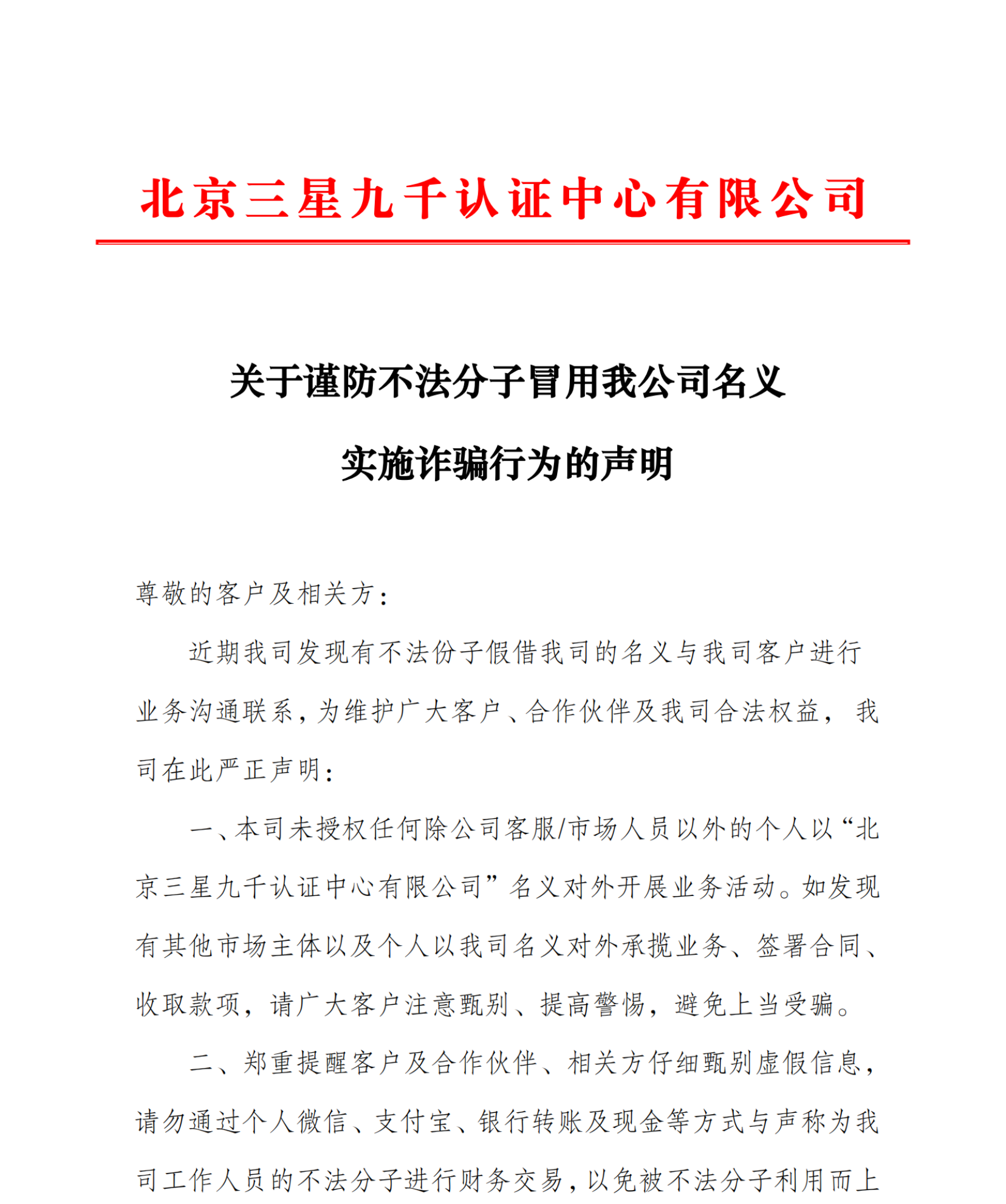 关于谨防不法分子冒用我公司名义实施诈骗行为的声明