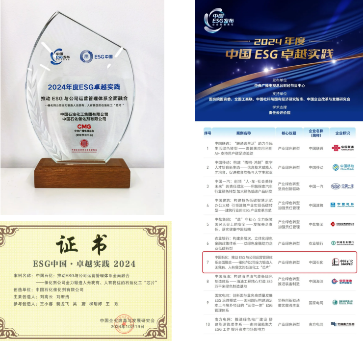 今年是联合国契约组织提出ESG理念的20周年,环境、社会和公司治理(ESG)受到的关注与日俱增,可持续发展已成为国际共识,有关标准规则日趋完善。为聚焦中国企业的卓越实践工作,中央广播电视总台与中国企业改革与发展研究会联合启动了“中国ESG卓越实践”案例征集活动,通过对458家企业报送的实践案例进行研究评价,遴选出31项案例为“2024年度中国ESG卓越实践”案例。中国石化集团公司报送的“推动ESG与公司运营管理体系全面融合——催化剂公司全力锻造人无我有、人有我优的石油化工‘芯片’”案例排名第7,荣获该称号。