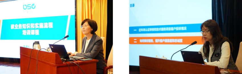 市场总监杨晔从服务和市场的角度,就各岗位人员应提升的专业能力、高效沟通能力、高效利用现代技术工具的技能、提升部门间的协作机制和服务响应速度的能力、及时关注政策法规变化及行业发展趋势等方面进行了详细精准的培训,为提升审核过程和技术服务过程中的客户满意度和忠诚度提供了指引。