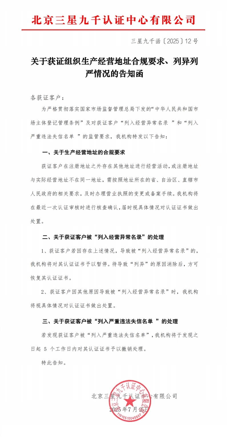 关于获证组织生产经营地址合规要求、列异列严情况的告知函
