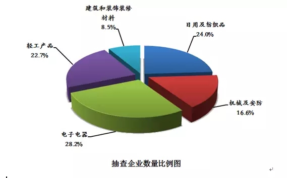 本次共抽查1411家企业生产的1447批次产品(不涉及出口产品)。经检验,1296家企业生产的1331批次产品合格,监督抽查合格率为92.0%;检出116批次不合格,不合格产品检出率为8.0%。按照抽查企业数划分,5类产品抽查比例见下图: