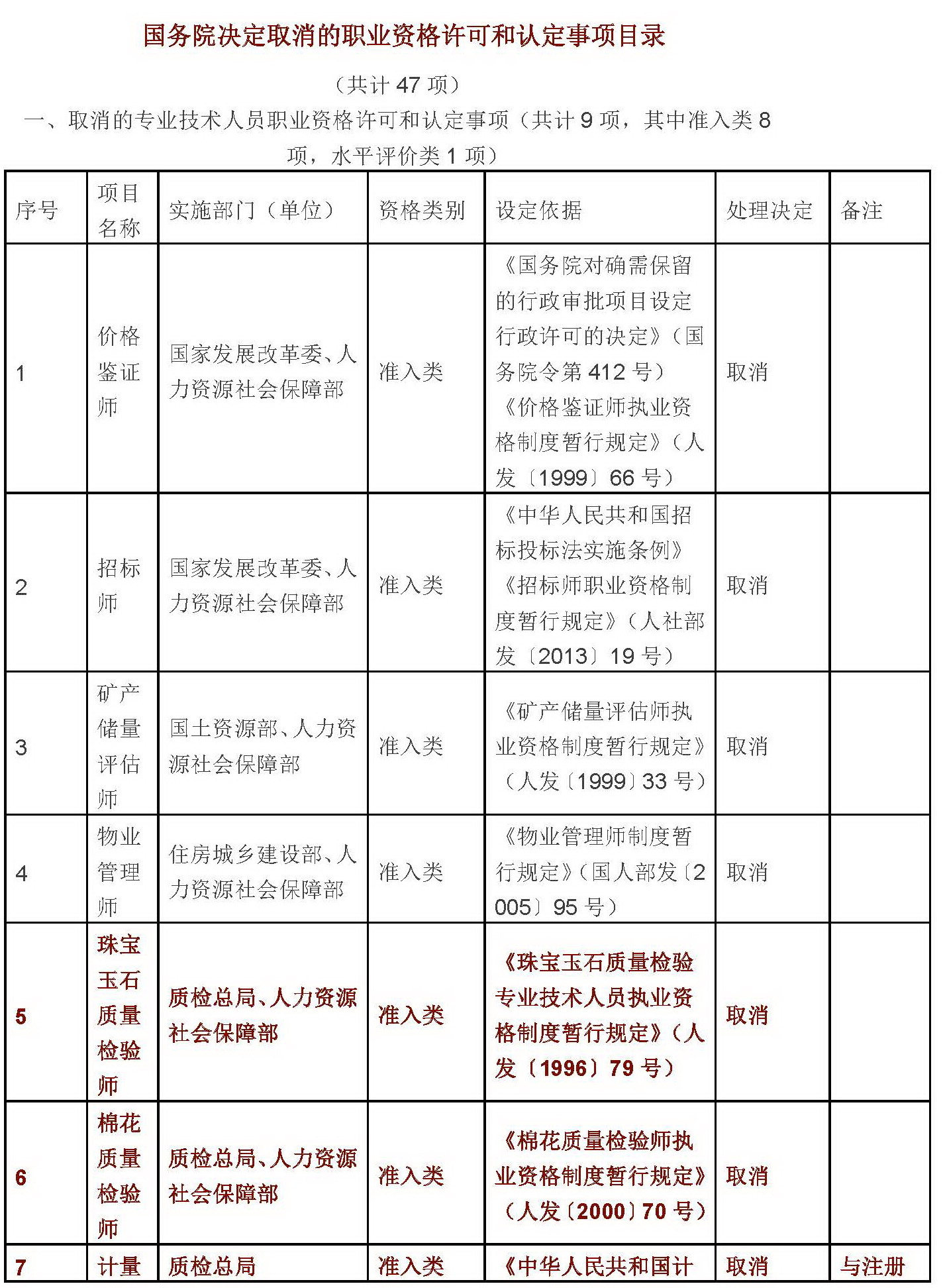 在本次取消的职业资格许可和认定事项中,珠宝玉石质量检验师、棉花质量检验师、计量检定员、合成材料测试员、室内装饰装修质量检验员、玻璃分析检验员等质量相关职业在列。(文末附前5批取消职业资格许可和认定事项中与质量人有关的职业资格证,请查阅)