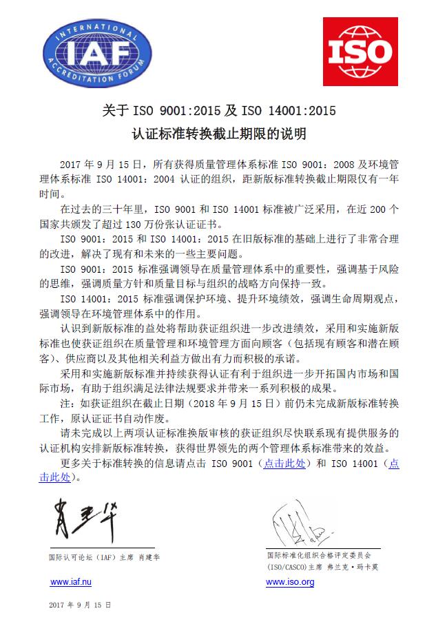 积极推动ISO9001:2015及ISO 14001:2015认证标准转换工作