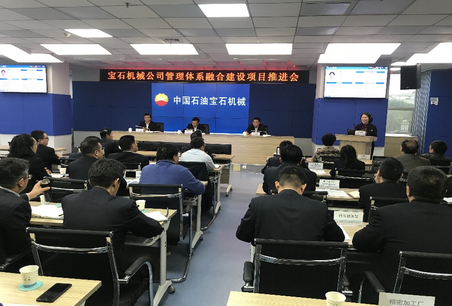 中国石油宝鸡石油机械有限责任公司综合管理体系融合项目自2018年3月启动,经过前期调研、方案策划、对接研讨、征求意见、分层决策,于2018年5月10日正式召开体系融合建设项目推进会。会议由宝石机械公司副总经理邹荣主持,三星九千认证中心技术服务组、宝石机械公司副总师以上领导、各机关处室主要领导及业务骨干共60余人参加了会议。