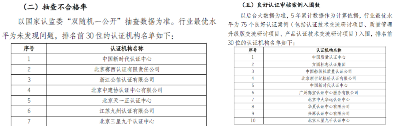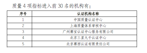 六类评价中,质量指标是核心,北京三星九千认证中心(以下简称三星九千)在衡量认证机构认证质量5项指标中,有4项指标——抽查不合格率(行业最优水平为未发现问题)、注册认证人员充分率、良好认证审核案例入围数、投诉率(行业最优水平为零投诉)排名前列。其它类指标中,还在主持/参与编制的国标行标数、参与政府部门和认证行业及相关管理部门的项目数、核心期刊发表论文数、诚信信息等创新、信誉、品牌类指标排名领先。