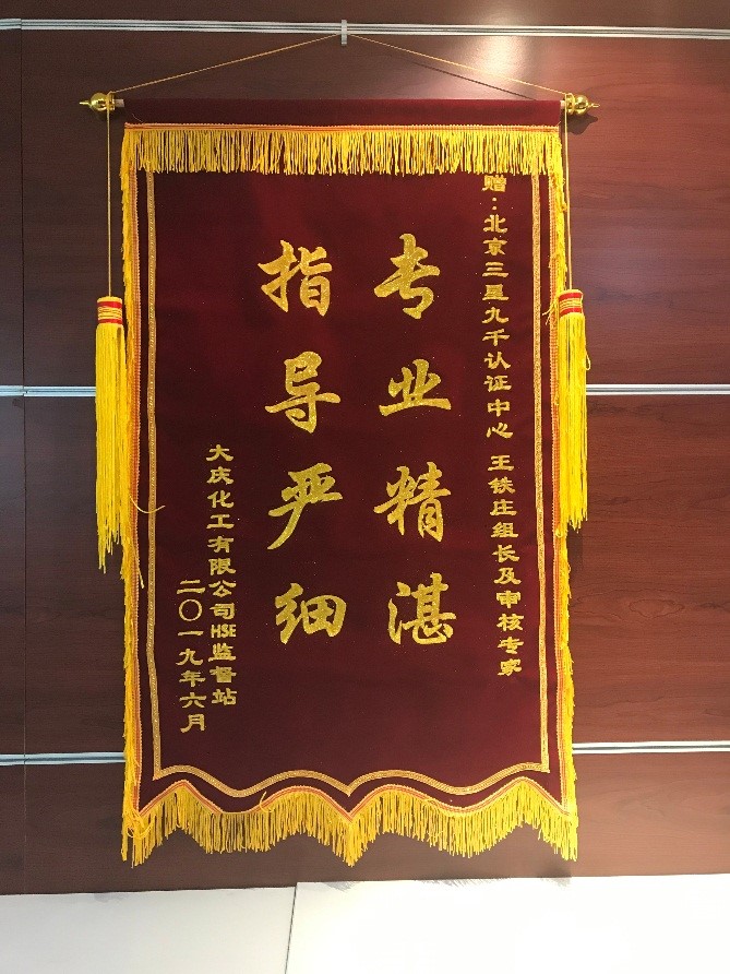 客户赠送的锦旗是对中心审核团队最大的肯定,充分体现了客户对中心审核员职业精神和专业能力的认可和赞许。据悉,大庆油田化工审核组由王铁庄老师担当审核组长,马佳、周振宏、薛建、阮增伟、张永超、刘友珍、李玉红、杨庆鸿、赵莉(大庆)、张艳等审核老师担任组员。在审核期间,审核组一直秉持客观、公正、负责的工作态度,认真审核、严格把关,以专业解决问题,用服务助力客户提升价值,得到了客户方的充分认可与尊重,在客户心中树立了三星九千品牌的良好形象。