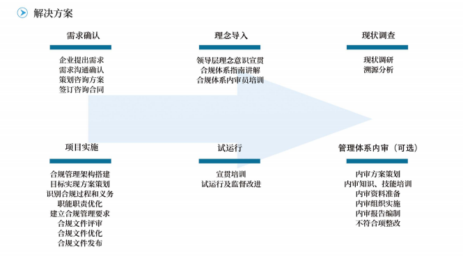 三星九千指导企业完善合规管理治理架构,建立明晰的合规管理职责体系;确定合规管理方针、目标,制定、完善合规管理措施;建立合规义务信息系统,实时跟踪最新法律法规要求;明确组织合规义务,识别、评价组织合规风险,建立合规风险数据库;以合规风险为导向,健全合规管理制度文件,明确合规管理要求;开展合规培训,推动企业合规能力建设;建立合规管理绩效监测、评审机制,推动合规管理体系持续改进。