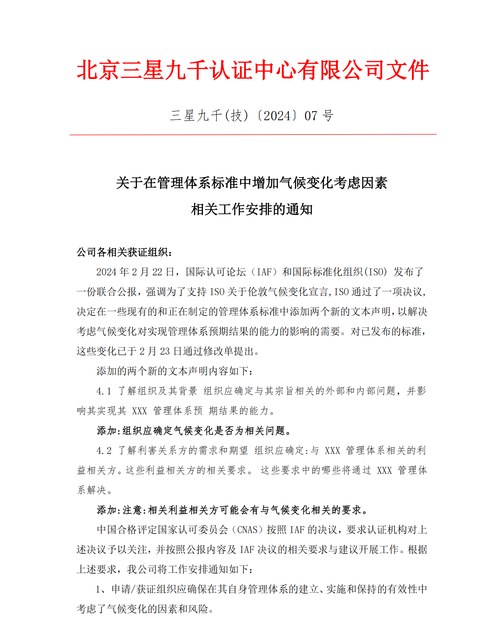 三星九千(技)〔2024〕 07号 关于在管理体系标准中增加气候变化考虑因素相关工作安排的通知