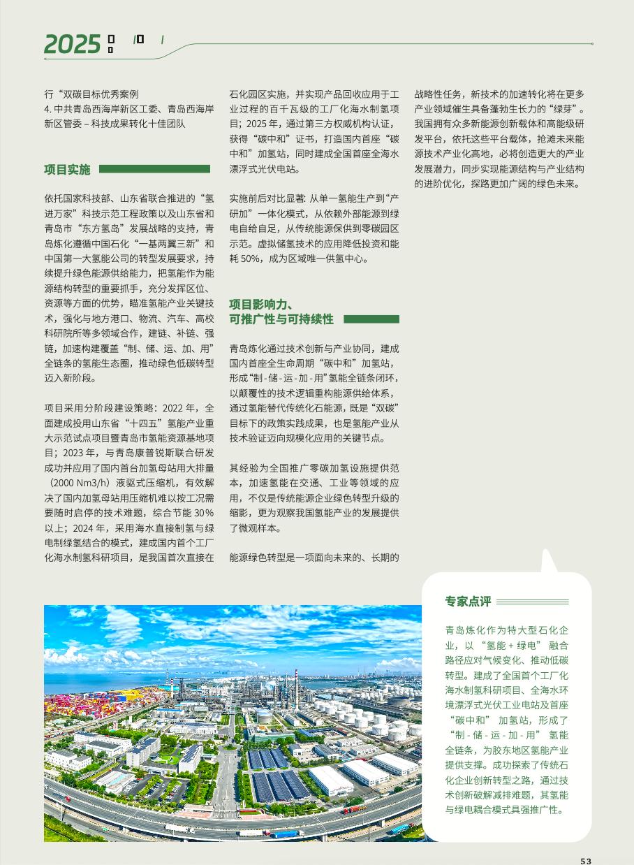 中国石化青岛炼化建成全国首个工厂化海水制氢科研项目和全国首个全海水环境漂浮式光伏工业电站,通过了三星九千全国首座加氢站碳中和评价,成为胶东地区唯一的燃料电池氢供应中心,入选“氢进万家”科技示范工程,为传统能源企业绿色低碳转型提供了可复制的工业耦合范式。