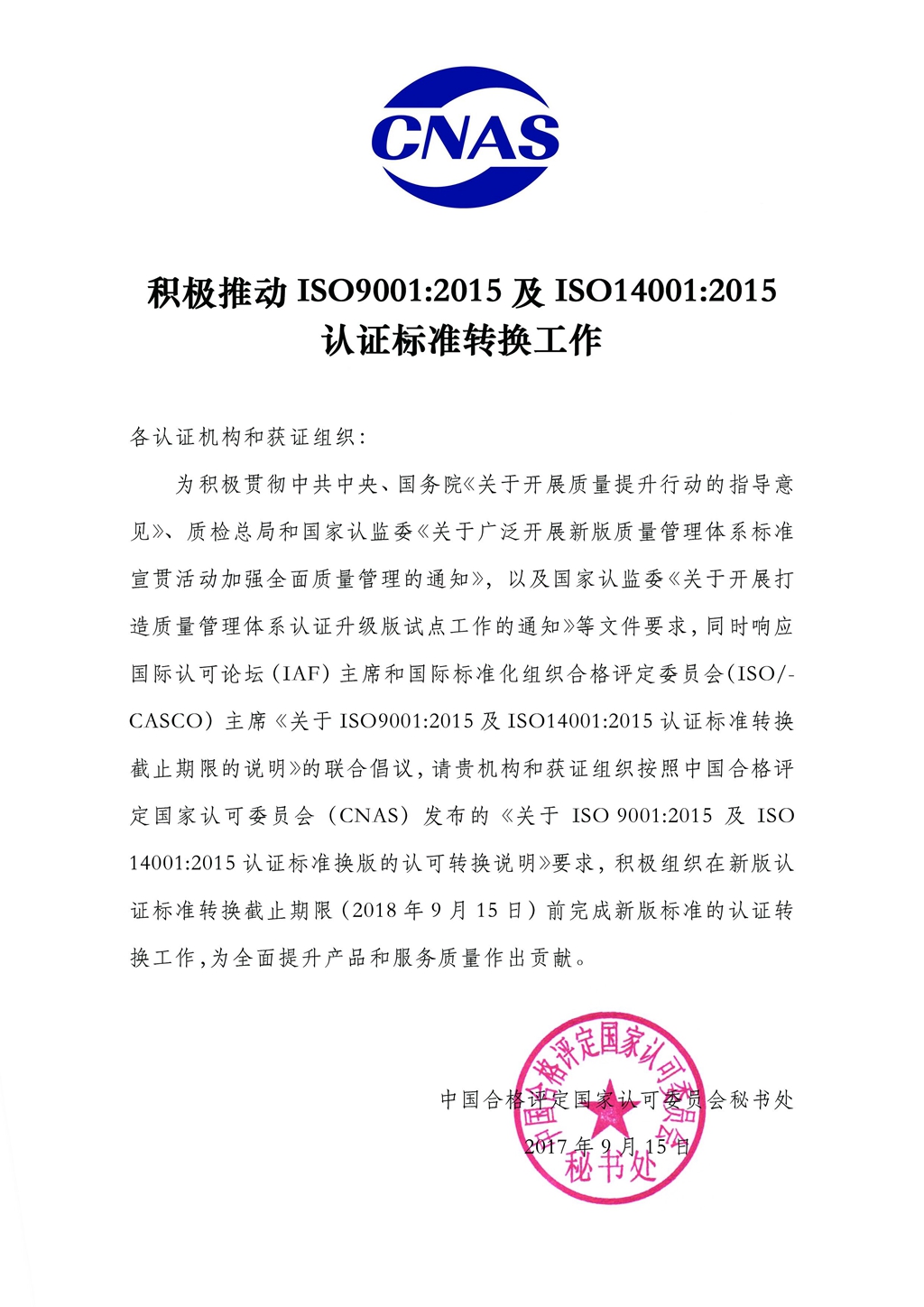 积极推动ISO9001:2015及ISO 14001:2015认证标准转换工作